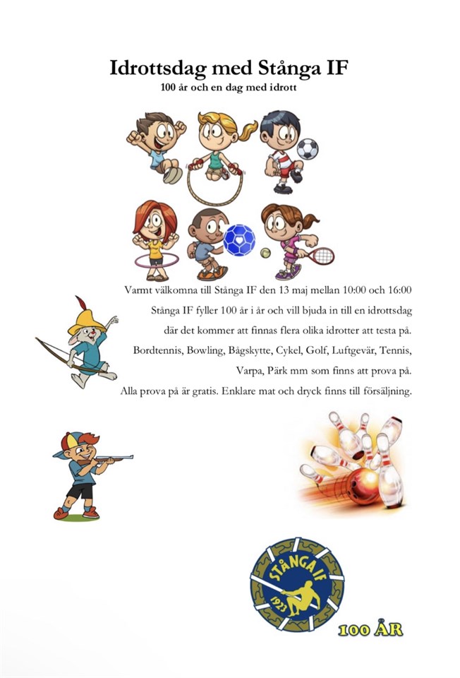 100 år av idrott fortsätter in i framtiden! Stånga IF bjuder in dig till en dag med möjlighet att prova på de idrotter som finns i Stånga. Inte bara under Stånga IF:s stolta märke, utan även andra aktörer i socknen. Välkomna! https://m.facebook.com/events/1260343128197558 Stånga IF 23 apr 2023 0kommentarer